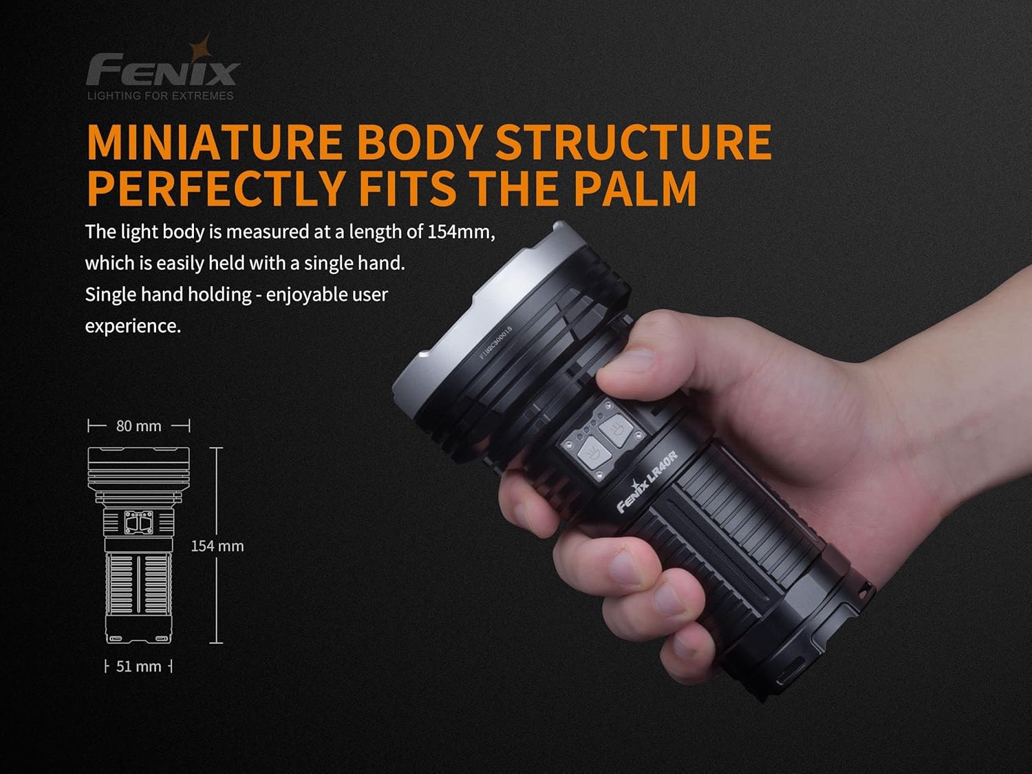 The Fenix LR40R V2 gets its power from the built-in ultra-large capacity battery pack constructed from 3 batteries of 5000mAh, allowing you to reach 177 hours ultra-long runtime from a full charge. The flashlight has a built-in intelligent sensing circuit which means that when the light head is close to an illuminated object, the flashlight will automatically downshift the brightness level with a sensing distance is withing 60mm. This feature can prevent danger caused by high temperatures. This lightweight flashlight features up to 25 hours runtime in Eco mode and with the built-in Type-C Charging port, the battery can be fully charged for an approximately 4 hours from a depleted state. It has also an accurate and reliable battery status through the LED read-out indicators.