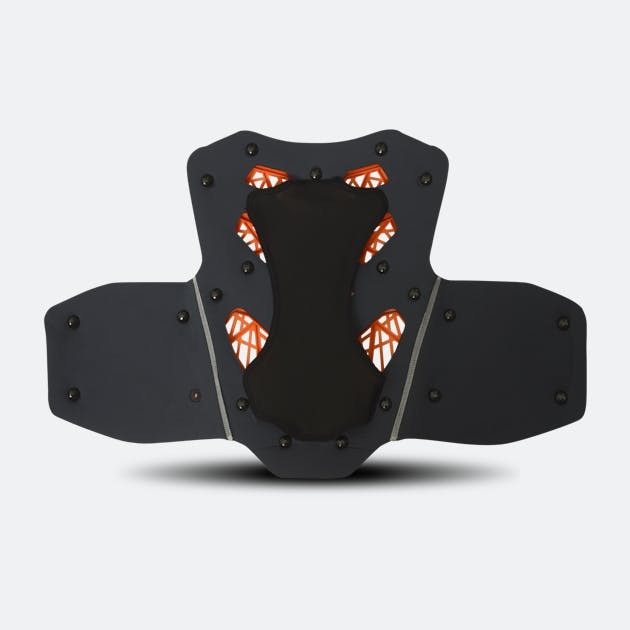 - Back and front protector with removable lower plate to accommodate a neck brace