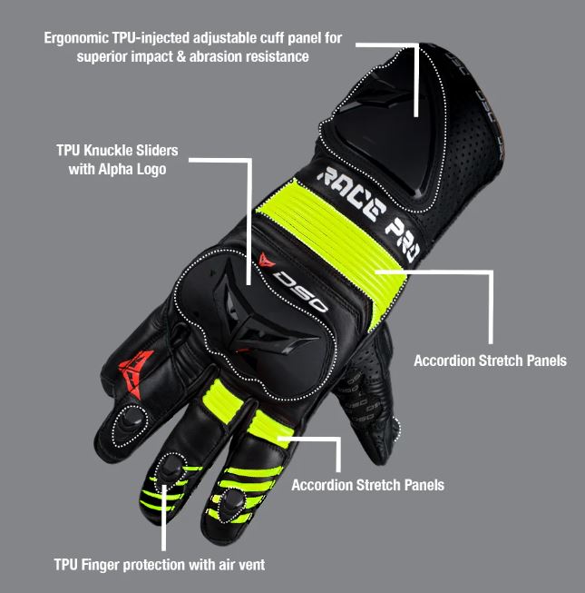 A bold design statement, the 3D Alpha logo is prominently featured on both the TPU knuckle protector and TPU ulnar protector, reinforcing its aggressive, track-ready identity. Crafted from perforated leather, the RacePro Sport ensures optimal airflow, keeping hands cool and comfortable even under intense riding conditions.