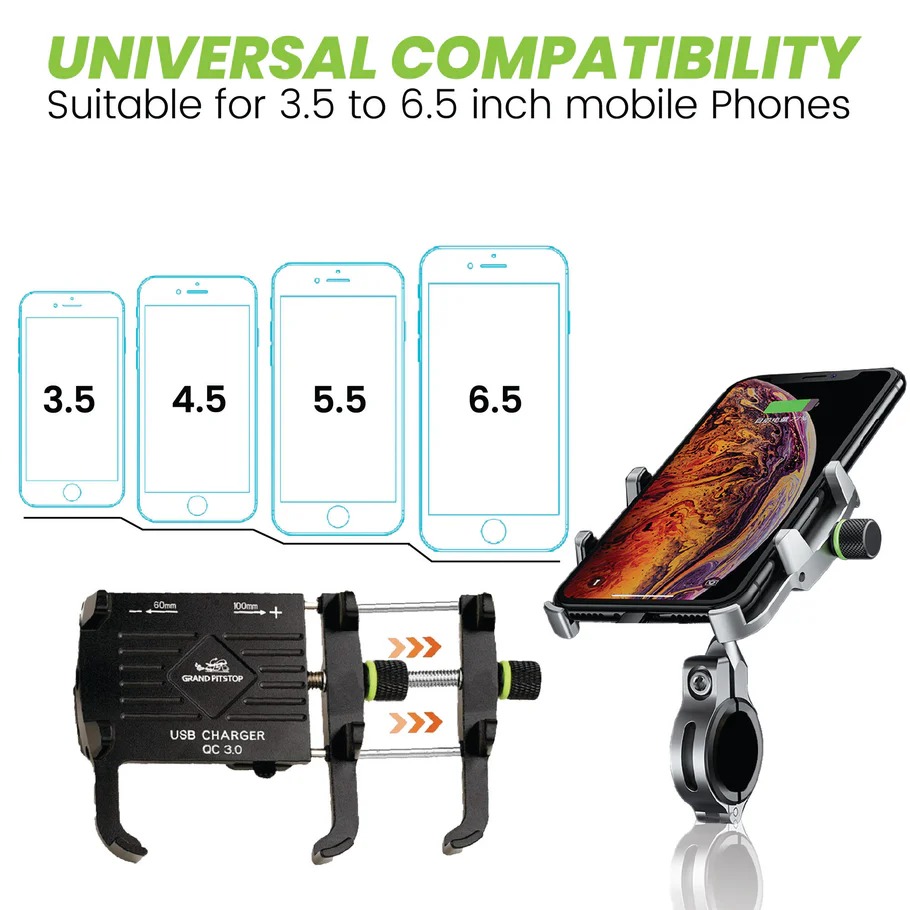 Ride with confidence and stay connected using this advanced claw with jaw grip mobile holder featuring a built-in USB charger. Designed for maximum stability, the strong metal claw and jaw grip securely hold your smartphone even on rough roads. The adjustable rotating knob ensures a perfect fit for different phone sizes, while the 360° shock-absorbing ball joint allows smooth angle adjustment for navigation and hands-free use. With a water-resistant USB charging port and backside ON/OFF switch, this holder is ideal for long rides and all-weather conditions.
