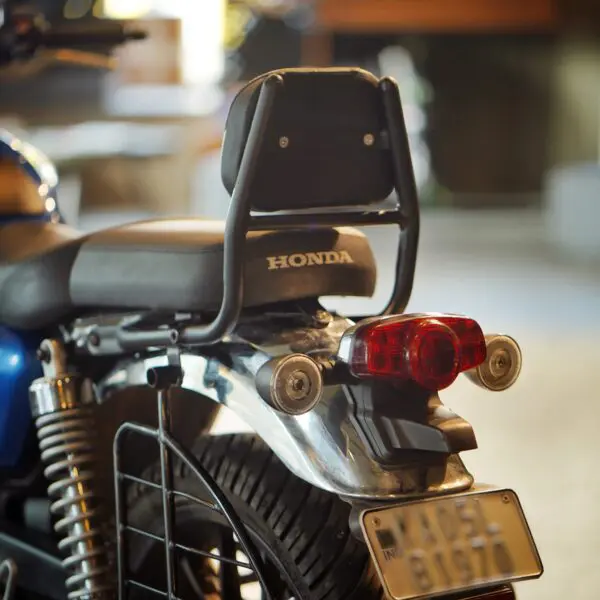 The all-new Honda H’ness Backrest Type 2 with Helmet Lock in Facility. Made with high-strength steel wrapped in high-grade cushion foam in-between. This ensures a secure and comfortable restraining of the pillion in the event of sudden acceleration. The Backrest is shaped not only to complement the sophisticated looks of the Honda H’ness but also to be helpful in grabbing and moving the bike around in a parking space, and also to be a provision to grab and lift the heavy bike up in case of a fall.