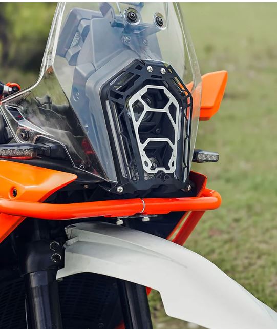 Enhance both the protection and rugged appeal of your KTM Adventure 390 (2025 model) with the Mild Steel and Aluminium Headlight Grill in Silver and Black, available at Legundary Custom Built. Crafted with a robust combination of mild steel for the frame and aluminium for the grill design, this accessory is engineered to shield your headlight from flying debris, stones, and off-road impacts without compromising visibility. The precision-fit ensures seamless installation, while the dual-tone silver and black finish adds a stylish, adventure-ready touch that blends perfectly with the aggressive stance of the KTM 390. Whether you're cruising through city streets or exploring rough trails, this headlight grill offers reliable protection and bold aesthetics in one smart upgrade.