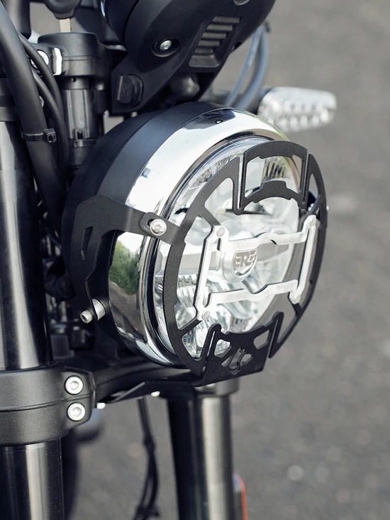 The Legundary Royal Enfield Bear 650 Mig Headlight Grill With Number Plate, available at Legundary Custom Built, is a functional and stylish accessory designed to enhance your motorcycle aesthetics while offering protection. This grill is crafted from high-quality materials, ensuring durability and resistance to wear, making it ideal for rugged use. Its dual-purpose design protects the headlight from debris and impacts while seamlessly integrating a space for the number plate, adhering to road safety regulations. With a sleek, modern look and easy installation, this accessory is perfect for riders who value both style and practicality for their RE Bear 650.