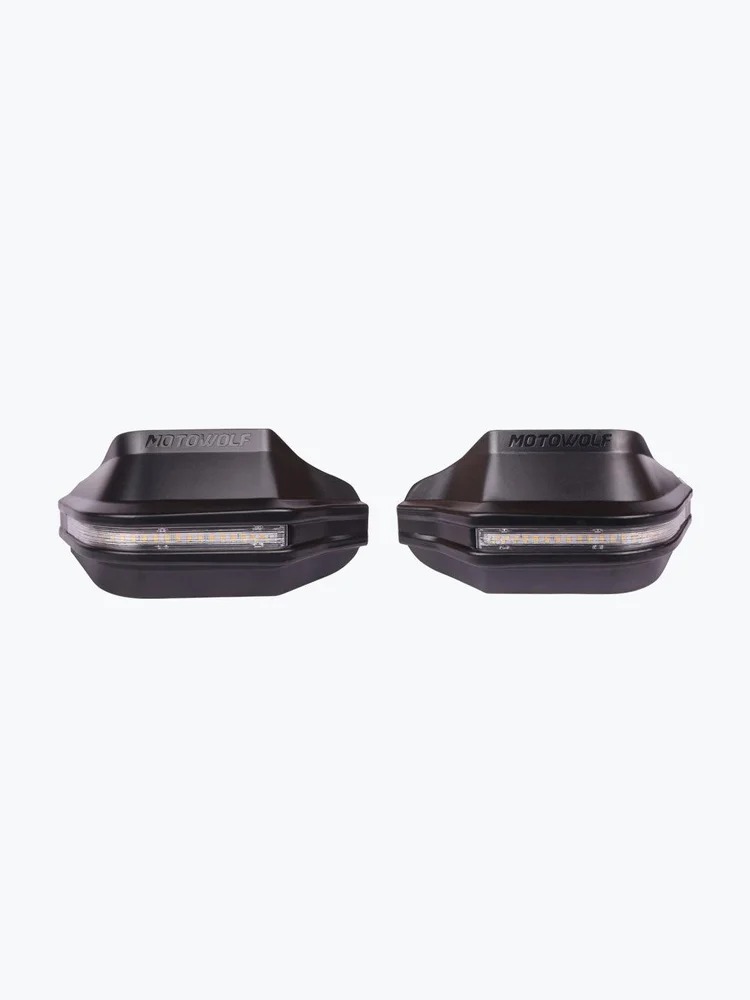 Upgrade your motorcycle's protection with the HANDGUARD MOTOWOLF WITH DRL 702 BLACK. Featuring a built-in daytime running light, these handguards not only shield your hands from debris and weather but also increase your visibility on the road. Ride with confidence and style with this must-have addition to your bike.