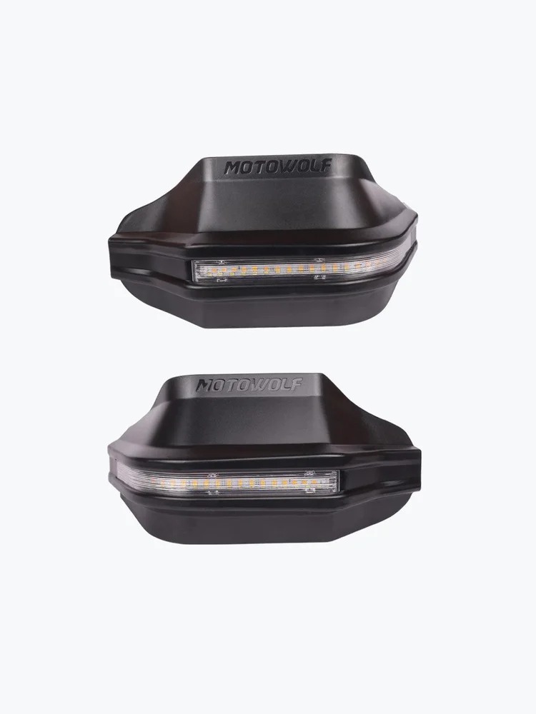 The MOTOWOLF HANDGUARD 702 BLACK features a bold and stylish design with a black hand guard and yellow and white DRL. Expertly designed to fit with full fittings, it offers superior protection and ensures a safe journey.