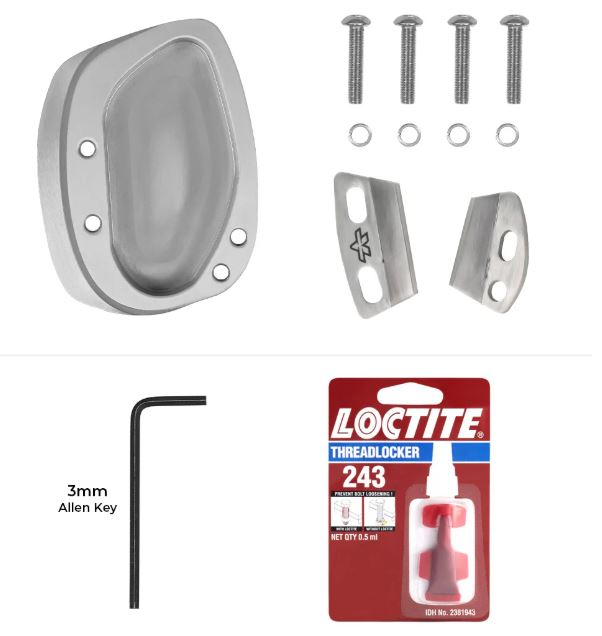 Side stand shoe top plate – 1 set Side stand shoe bottom plate – 1 nos All necessary fasteners & washers included (refer to installation manual) Loctite 243 threadlocker (0.5ml pack) included Allen key included