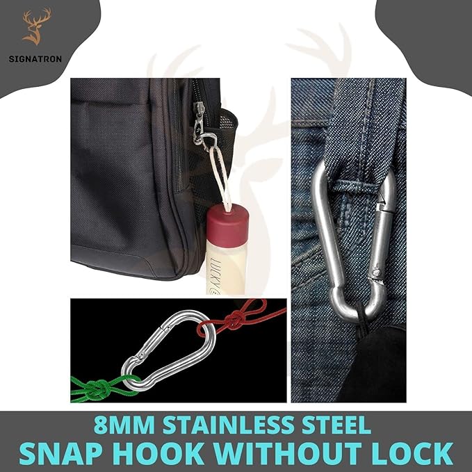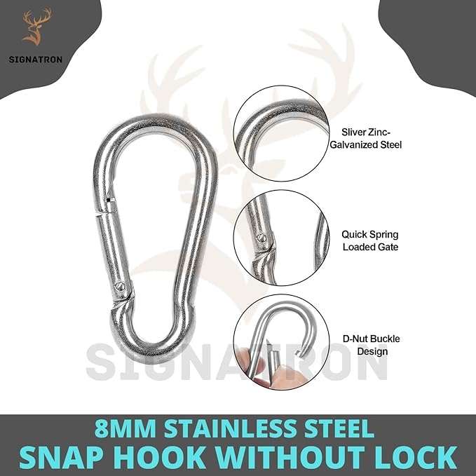 Includes Set of quick links with spring action gate for making quick attachments to rope, straps, chains and cables · Opens and closes smoothly as the spring- loaded gate makes it easy to attach important items to it. · Package contents: 5 x carabiner hooks, 3-3/16" (5 x 60mm) · Made of stainless steel that protects against corrosion · Great for dog leash, camping, fishing, traveling, hiking, connecting items to a belt and any outdoor use · Versatile binding, rigging and anchoring hardware ·