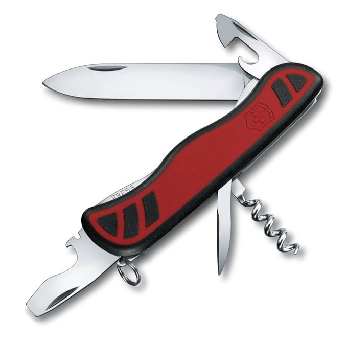 - Tools: 1. large blade 2. corkscrew 3. mini screwdriver 4. scissors 5. bottle opener 6. can opener 7. screwdriver 5 mm 8. wire stripper 9. multipurpose hook 10. nail file 11. toothpick 12. tweezers 13. pressurized ballpoint pen 14. pin, stainless steel 15. key ring