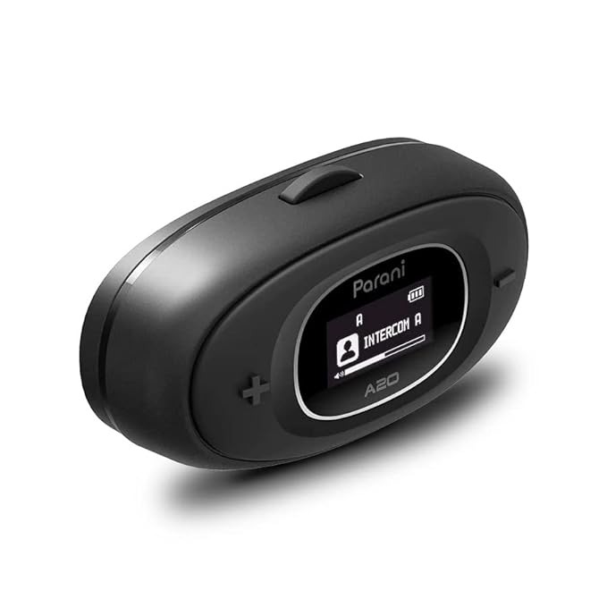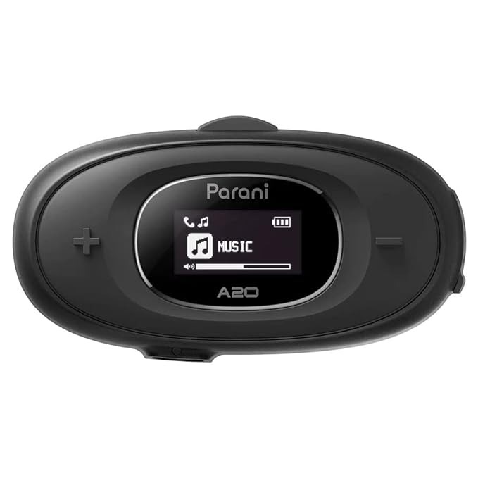 The Parani A20 is a sleek Bluetooth® intercom headset designed to fit most motorcycle helmets. A20 brings a premium audio experience to the conversation, with a 30% increase in the intercom system's bass and overall clarity. Up to quality further with 2-way HD Intercom, which is enabled when two Parani users pair their devices to one another. The Parani A20 supports up to four Parani Bluetooth intercom devices pairing to each other, allowing users to communicate with an effective range of up to 1 km (0.6 mi) and an impressive talk time of 16 hours. The headset sports a three-button control screen and an LCD screen, giving users quick visual cues on statuses such as volume level, battery life, and more. Parani A20 includes both a boom mic and a wired mic for user preference.