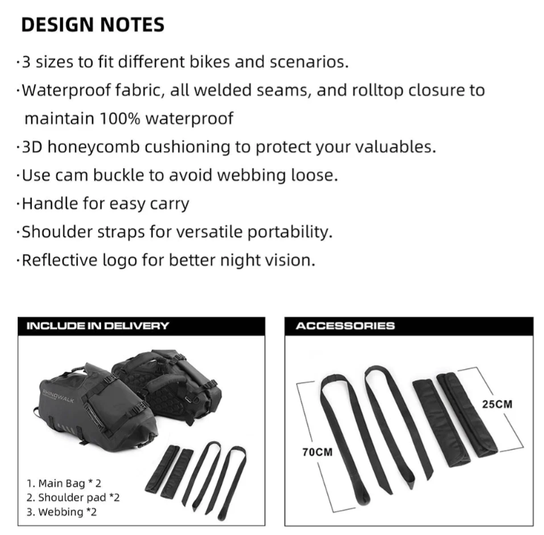 ✔ BETTER FOR MOTORCYCLE: Simple and practical combination makes motorcycle side bag more convenient to place and fix. You can adjust the distance between the two waterproof bike bags with the Velcro strap and buckle. Fits more motorcycles.