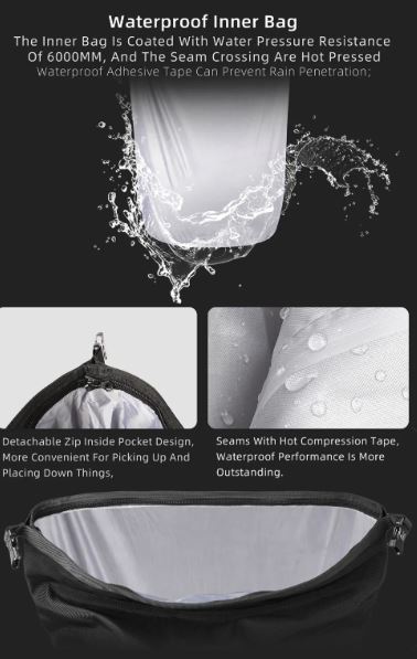 Waterproof: The inner bag is coated with water pressure resistance of 6000MM, and the seam crossing are hot pressed waterproof adhesive tape can prevent rain penetration, the waterproof performance is outstanding.