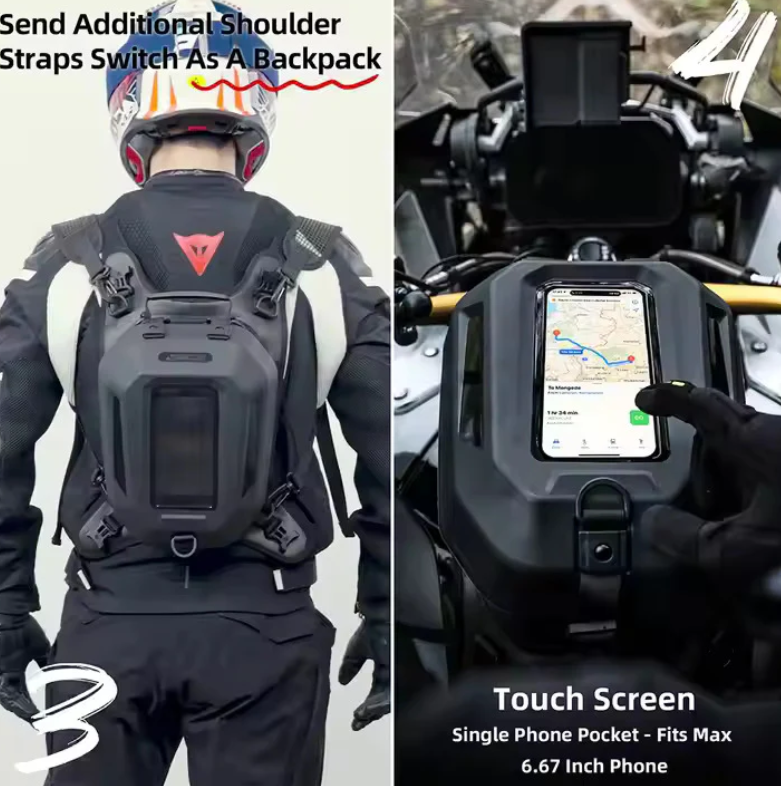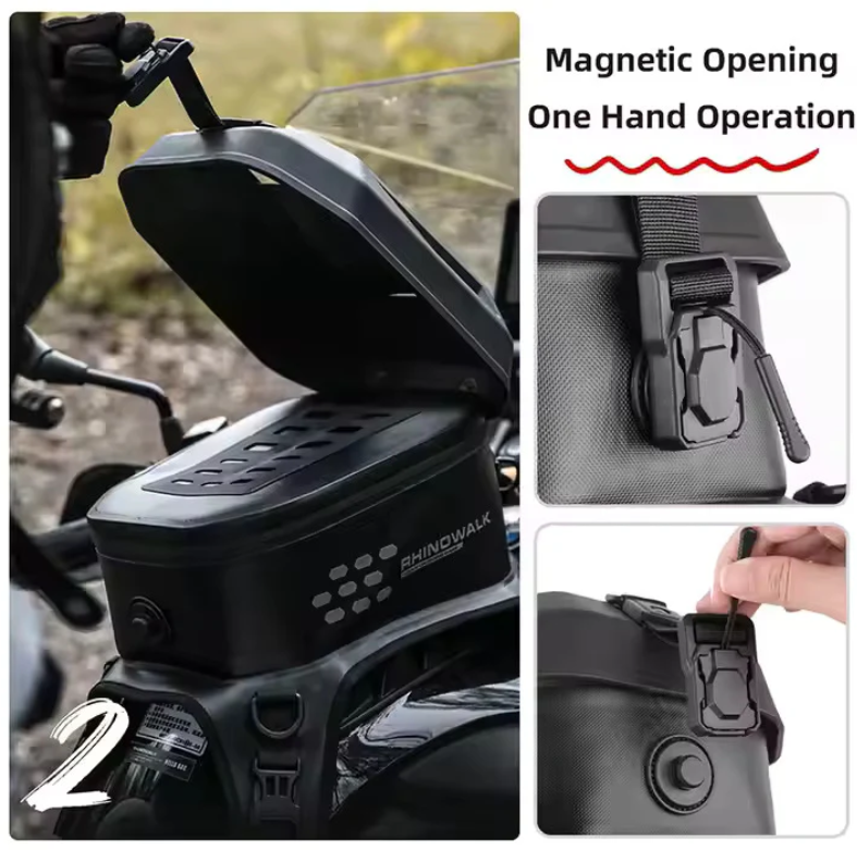The Rhinowalk 5.6 Liter Waterproof Motorcycle Tail Bag combines durability and functionality for serious riders. Crafted with waterproof materials and TPU construction, it protects your gear from harsh weather. Its strap-on design ensures secure attachment to your bike’s tail or tank, while the integrated phone holder offers convenient access and visibility. With a 5.6-liter capacity, this bag provides ample storage without compromising aerodynamics, making it an essential accessory for efficient and organized rides.